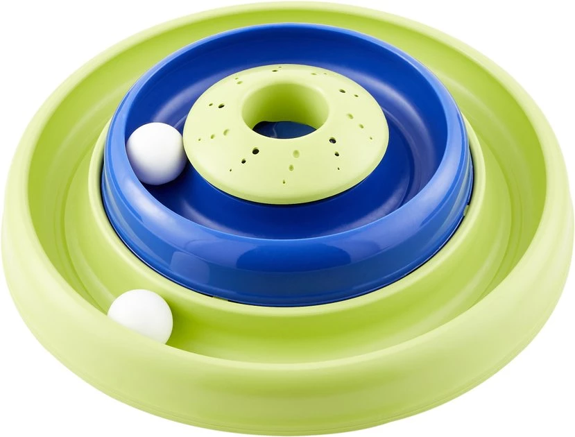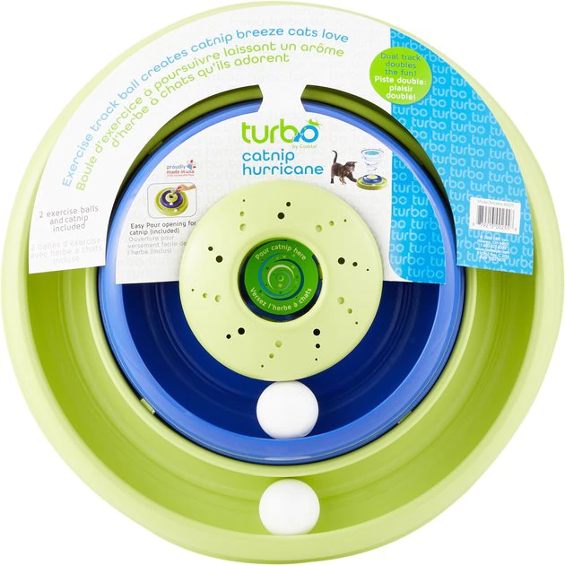The Catnip Hurricane will stimulate your cat with the euphoric aroma created by inserting catnip in the center. The whirling motion of the balls will continue to stimulate your cat to come back for more! Two tracks, two balls, and twice the feline fun.