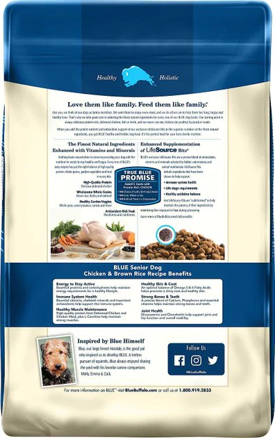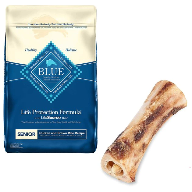 - Comes with: 30-lb bag of Blue Buffalo Life Protection Formula Senior Chicken & Brown Rice Dry Dog Food and one Bones & Chews 6″ Roasted Marrow Bone.