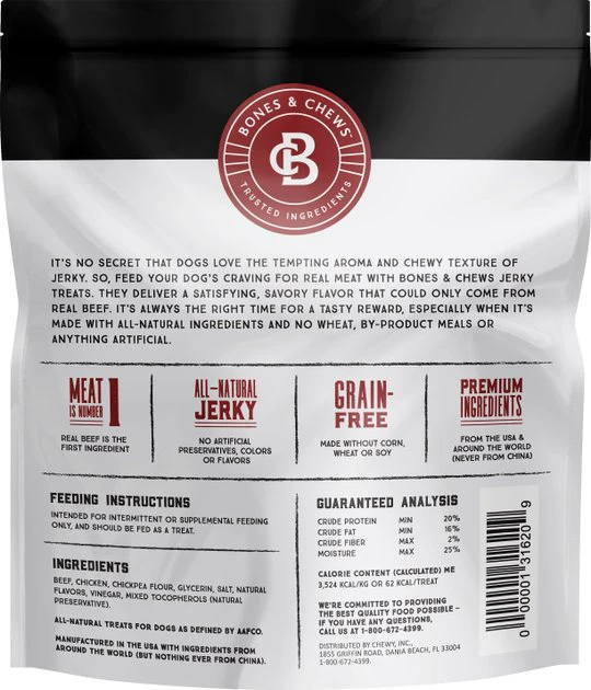 Bones & Chews Beef Jerky Treats are intended for intermittent or supplemental feeding only, and should be fed as a treat.