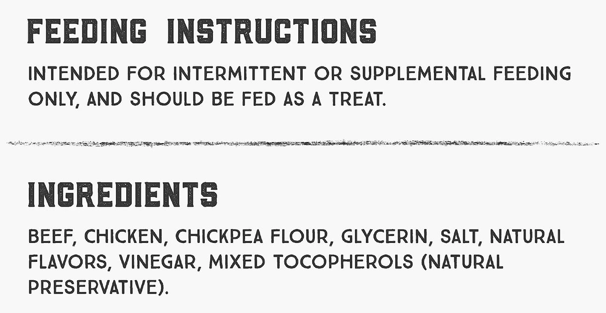Beef, Chicken, Chickpea Flour, Glycerin, Salt, Natural Flavors, Vinegar, Mixed Tocopherols (natural preservative).