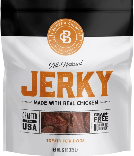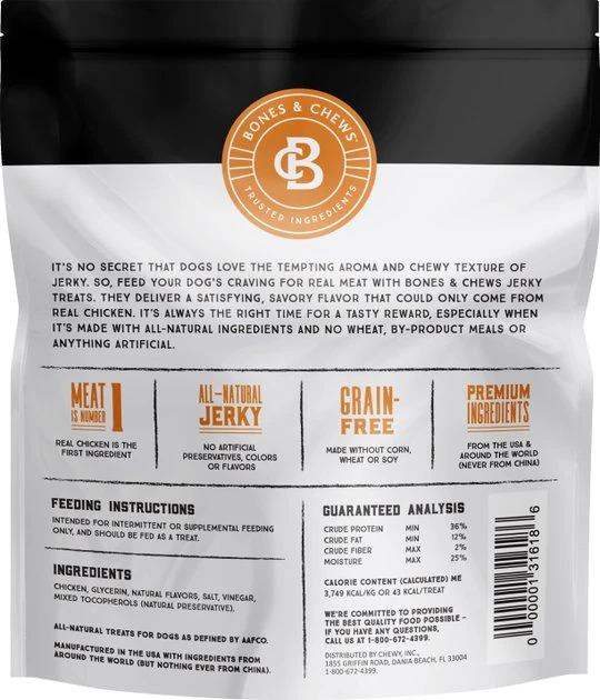 With Bones & Chews All-Natural Chicken Jerky, you can reward your pup with the rich, meaty flavor of genuine jerky in a satisfying treat made just for dogs. These jerky treats are crafted in the USA using just six natural ingredients from around the world, with nothing ever from China. Real chicken starts off the recipe, delivering a tempting aroma and savory taste from a delicious protein source that dogs instinctively crave. It has everything you’d expect from a quality jerky, and none of the extras you don’t want, like grains, corn, wheat, soy, by-product meals or artificial preservatives, colors or flavors. Bones & Chews All-Natural Jerky is a delicious, mouthwatering snack that’s perfect for treating the entire pack.