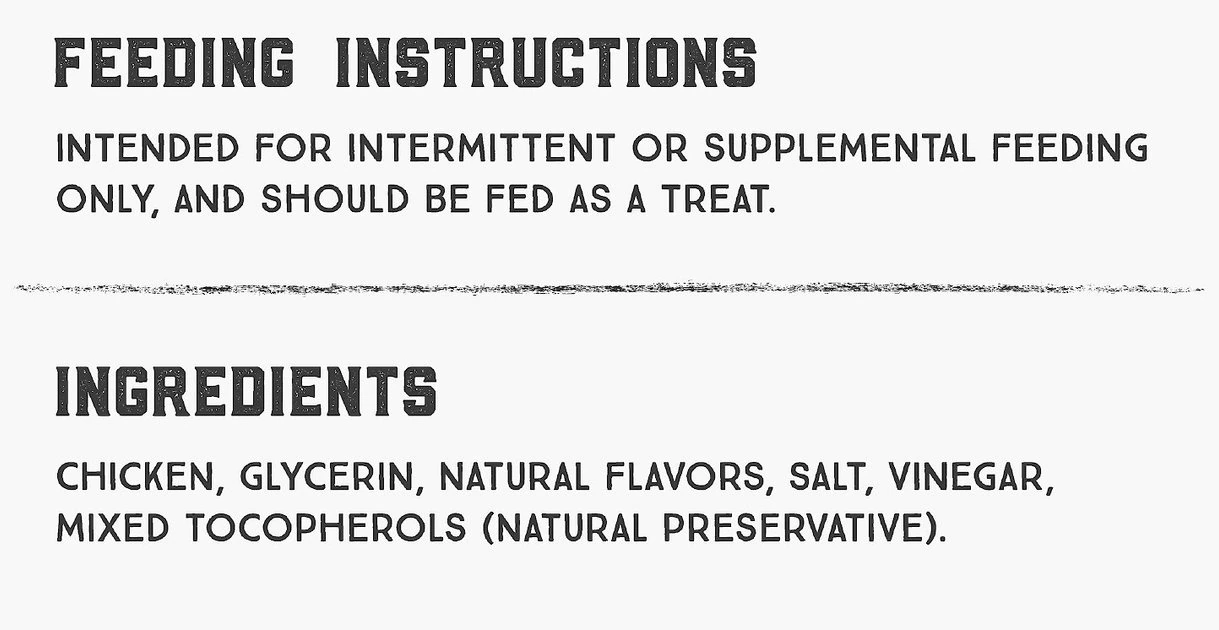 Chicken, Glycerin, Natural Flavors, Salt, Vinegar, Mixed Tocopherols (natural preservative).