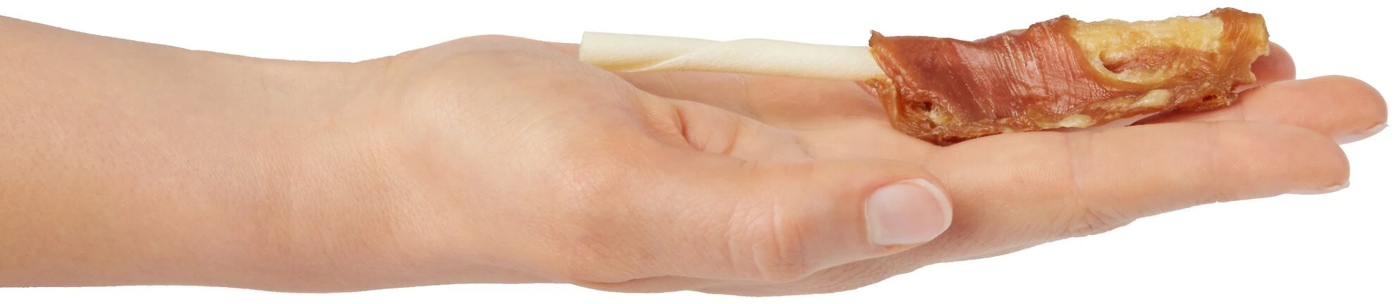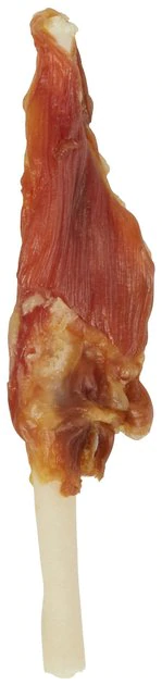 Bones & Chews Chicken Wrapped Rawhide Skewer Dog Treats combine real beef hide with pup-preferred chicken for a tasty double take on your dog’s chewing pleasure. In the middle, there’s a beef hide stick for your dog to gnaw down to. Around the outside, there’s a thin, delicious chicken wrap. All over, these are long-lasting, high-protein treats your dog just won’t be able to resist. While they chew, they’ll not only relieve their boredom, stress and anxiety. That chewing action pulls double duty, just like these treats! Their chewing will also support their healthy teeth and gums. Plus, these treats are free of artificial colors and flavors, and they’re grain-free with no added corn, wheat or soy ingredients, so you can trust these treats are not just tasty but trustworthy too!