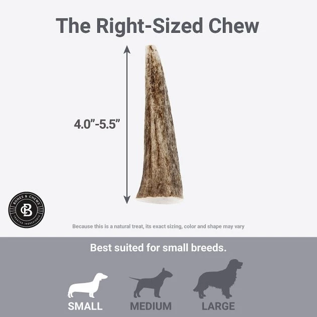 Even picky pups will succumb to the influence of a Bones & Chews Made in USA Elk Antler Dog Chew. This 100% natural antler is low odor and non-allergenic and provides a source of calcium, phosphorous and other beneficial nutrients. Elk antler chews are naturally shed and renewable. They support bone and muscle health and their hard texture helps clean teeth, massage gums and exercise jaws as your dog chews.