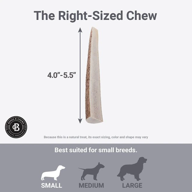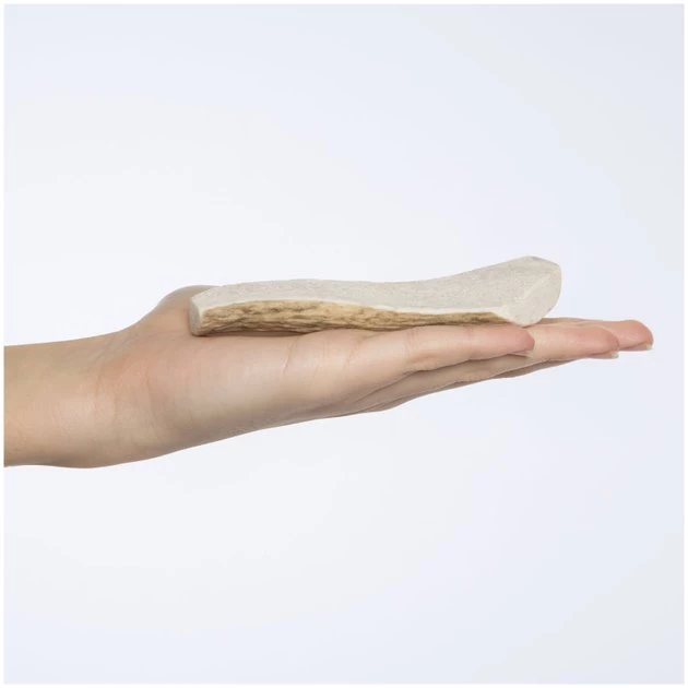 Even picky pups will succumb to the influence of a Bones & Chews Made in USA Elk Antler Split Dog Chew. This 100% natural treat is part of a hard antler that has been split to expose the bone marrow in the antler’s center. The softer marrow in the middle is gentler on teeth than whole antlers and provides a tasty bone marrow treat for added nutrients. Antler chews contain natural minerals that support bone and muscle health and the hard outer texture helps clean teeth, massage gums and exercise jaws as your dog chews.