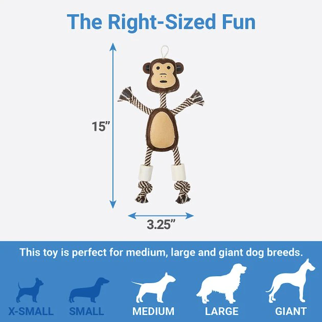 Dog toys are made for monkeying around, and this one is no exception! Fun will be in full swing when your dog grabs onto this toy’s canvas body and whips its classic cotton rope arms and legs around in a furry frenzy. And when it’s time for a little bit of down-tempo chewing time, your pup will have not one but two 1.5-inch water buffalo bones to chomp on. Plus, this buddy by Bones & Chews is squeakerless, so there’s no need to say “shhh” during your little monkey’s shenanigans.