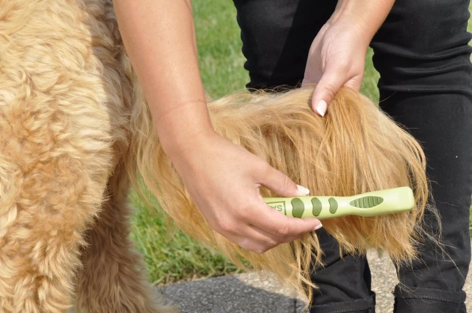 Keep your best friend’s coat smooth and healthy with the Safari Dog Mat Remover. Matted hair is not only unsightly, it traps moisture, dirt and odor, which can lead to potentially serious skin irritations. This high-quality grooming tool is designed to gently remove loose hair and eliminate tangles, knots and dander in all hair types. Manufactured with high-quality, rust-resistant stainless steel, the blades are extra sharp to cut through the toughest mats without pulling her hair, while the rounded edges help ensure her safety. Designed to groom and massage her coat, each stroke increases blood circulation to leave her looking and feeling great. The comfort-grip, anti-slip rubberized handle fits easily in your hand and helps prevent hand and wrist strain.