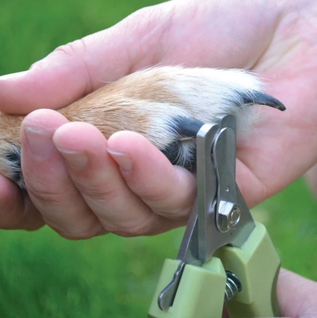 Holding the paw firmly, trim top of nail with a single stroke. Be careful to stop short of the quick, the blood vessel inside the nail. Use safety stop to prevent trimming nails too short. If pet’s nails are very long, trim a small amount. Repeat every 7-10 days until nails are at desired length. Monthly trimming should be sufficient thereafter.